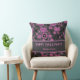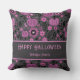 A cute and pretty Happy Halloween throw pillow featuring pumpkin and floral patterns in purple and black, perfect for families looking for fun and modern ways to celebrate Halloween this fall.