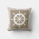 Travesseiro decorativo clássico do estilo náutico, com fundo de burlap faux rústico, quadro listrado branco e uma silhueta de helm de navio branco. A decoração costeira russa é facilitada com este moderno, mas rústico travesseiro decorativo de roda do navio.
