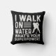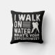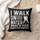 Travesseiro de texto branco sobre fundo preto que você pode mudar para qualquer cor que quiser, lê I Walk On Water What's Your Superpower?