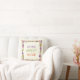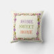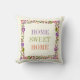 Belo travesseiro floral com flores bonitas em roxo e laranja, folhas verdes e o texto: "HOME SWEET HOME".Mude o texto com o seu.