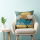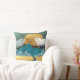Um travesseiro decorativo paisagístico de abstrato impressionante com uma ascensão solar ouro por trás de montanhas azuis arrojadas, contrastado com texturas e campos de ouro fluidos. As aves brancas voam através do céu nublado, adicionando movimento e serenidade à cena. A composição mistura elementos naturais e surreais, criando uma estética moderna e luxuosa que se sente calmante e poderosa. Perfeito para amantes de contrastes de cores ousadas e arte contemporânea inspirada na natureza.