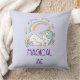 Um travesseiro com um design fofo e engraçado. Um milho branco com mana e cauda de cor pastel e 3 estrelas pequenas nas costas dela. Um arco-íris colorido. Cercado por uma coroa circular composta por nuvens, corações e flores para um talho feminino adicional. O texto diz Magical AF. Humor e adorável.