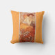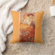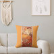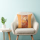 Um travesseiro decorativo com a ilustração de moda Topaz de Alphonse Mucha (1860-1939) é um exemplo do movimento Art Nouveau. A pintura retrata uma jovem figura feminina, com fundo decorativo padronizado em matizes laranja e toques da natureza. A figura feminina olha diretamente para o espectador com uma expressão relaxada e elegante.