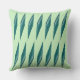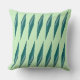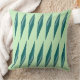 O trabalho de arte de travesseiro decorativo apresenta um padrão de formas de diamante ciano, alongadas, articuladas em forma de grade, ilusionário e tridimensional contra uma canvas verde-chá pastel fresca.