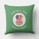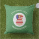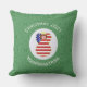 Um anjo vermelho veste a bandeira dos Estados Unidos da América neste travesseiro exterior para decoração de férias ou decoração de Natal. O anjo de Natal da bandeira dos EUA é encontrado dentro um círculo branco de quadrados pretos. O fundo é quadrado verde. Adicione seu próprio texto ou personalize com um nome e o ano.