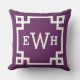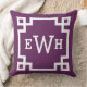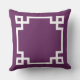 design na moda e travesseiro de sotaque quadrado moderno apresentam um design e um monograma de quadros geométricos de borda grego que podem ser personalizados. Cores de beringela/roxa de ameixa e branca. A cor de fundo pode ser modificada.