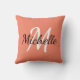 Travesseiro decorativo com fundo laranja de salmão e monograma personalizado branco primeiro nome e primeiro nome.