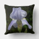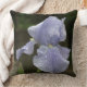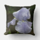 Azul bonito Suscita Travesseiro decorativo Reversível. A frente do travesseiro tem um close-up da flor azul bonito da íris com gotas amarelas e de chuva nas suas delicadas pétalas com um botão de flor à espera de florescer na primavera. A parte de trás do travesseiro tem um fecho de uma íris azul meio fechada com gotas de chuva e um botão de flor em caule longo e árvores verdes desfocadas no fundo. Fotografias feitas no jardim da íris. Copyright para fotografia original © TamiraZDesign.