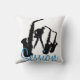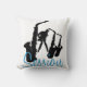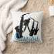 Sax formando a palavra "J(a)zz" com saxofonista para A. design preto com palavra azul "Sessão" e fundo branco (personalizável) no travesseiro quadrado.