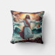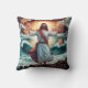 Esperando confiantemente nas margens rochosas, Jesus ergue os braços enquanto ondas turbulentas se chocam ao seu redor, mostrando paz divina em meio ao caos no pôr do sol.