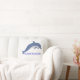 El elemento central es un delfín estilizado representado con un patrón que recuerda al arte, está saltando o nadando sobre un conjunto de olas vibrantes. Los colores predominantes son el azul turquesa, el azul marino oscuro y toques de blanco o un color de contraste, que destacan sobre el tela de otro color a crema, lino o blanco roto del cojín.