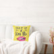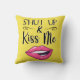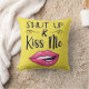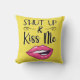 Este travesseiro de "beijo de tendências" apresenta um desenho de um par de lábios de batom magenta e a legenda "Cala a boca & Beije-me" numa fonte moderna preta, num fundo amarelo brilhante.