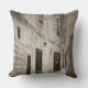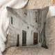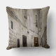 Travesseiro decorativo da foto que cushing com a lavanderia que consiste nas coberturas brancas que penduram para secar no sol na fachada de uma casa de pedra branca em um beco com escadas do arenito em uma cidade em Italia, criando opinião italiana/mediterrânea típica da rua.