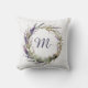 Purple lavender floral wreath with personalized monogram on abstract white textured wood background.