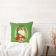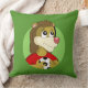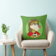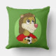 Travesseiro com ilustração da cabeça de um bonito vestido de leão sorridente em vestido desportivo vermelho que segurava uma bola de futebol, em círculo verde, ilustrado por Radka Kavalcova
