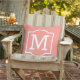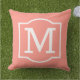 Na moda e travesseiro clássico de sotaque quadrado ao ar livre apresentam uma inicial de monograma com uma simples estrutura decorativa em branco com cor de fundo rosa/laranja coral. Personalize o plano de fundo para coordenar com a decoração exterior.