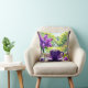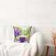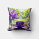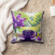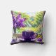 Um travesseiro bonito com uma ilustração maravilhosa de uma vibrante lilases roxas sentadas num vaso de vidro, junto a uma xícara de vapor de café quente num dia brilhante de verão.