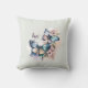 Um travesseiro com um trio de borboletas balançando entre algumas flores bonito. Esquema de cor rosa azul e verde.