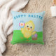 Este design colorido apresenta o texto "Feliz Páscoa" com um bebê frango e decorações de ovos de Páscoa. A parte de trás da almofada tem um coelhinho de Páscoa fofo com MUITOS ovos de Páscoa.
