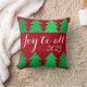 Este travesseiro bonito apresenta duas fileiras de árvores verdes cortadas e um cartões de natal festivo de alegria para todos com o ano.