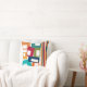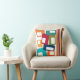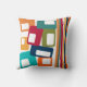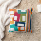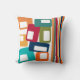 Este travesseiro decorativo tem um design moderno do século médio de linhas e retângulos em tons retrorados de laranja, ouro, amora, chalé, verde, azul, turquesa e verde.