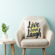 A imagem apresenta a frase "Live Love Laugh" escrita em letras negrosas e cursivas. O texto é colocado sobre um fundo vibrante com um centro amarelo e listras coloridas radiantes em tons de rosa, laranja e amarelo, parecendo uma explosão de luz ou fogos de artifício. O design geral é animador e animador, transmitindo uma mensagem positiva e motivacional.