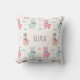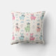 Este travesseiro decorativo de crianças fofo e personalizado apresenta lhamas cartoon em cores pastéis moles cercadas por estrelas, corações, nuvens e esboços de cactos, todos colocados contra um fundo branco-creme.