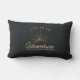 Um travesseiro lombar com uma ilustração dourada sobre um fundo de cinza preta. Projetado com uma ilustração de uma montanha com raios solares brilhando por trás. A tipografia diz: "A vida é uma descoberta de sonho de uma Aventura".