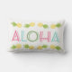 Bem-vindos a nossa casa com um design de travesseiro de estilo tropical que apresenta uma tipografia colorida "Aloha" e uma borda festiva de abacaxi amarelo. Inclui cor rosa claro, azul-aqua, verde-folha, amarelo-sol e branco.