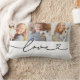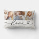 O design de travesseiro decorativo lombar personalizado moderno e na moda apresenta uma colagem de fotos de três (3) fotos favoritas com um design de tipografia preto simples e mínimo "Love" que inclui detalhes florescentes e cardíacos. As cores preto e branco podem ser modificadas.