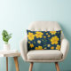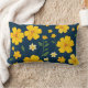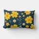 Este é um travesseiro lombar que tem um fundo azul escuro com flores amarelas.
