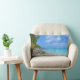 A pillow with a scenic tropical photograph. A secluded beach with white sand and turquoise water.