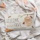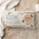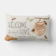Bem-vindos a convidados com este travesseiro decorativo lombar bonitinho, com ilustrações aquáticas de abelhas melíferas, colmeia e colmeia, com "bem-vindos à nossa colmeia" em letra de marfim. Personalize com o seu nome de família na parte inferior.