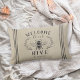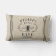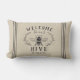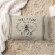Bem-vindos convidados com este travesseiro decorativo de tema de abelhas bonitinho, com uma ilustração de abelha de mel do estilo vintage, enfeitiçada com folhas botânicas e trim de corda detalhando sobre um fundo bege suave. "Bem-vindos à nossa colmeia" aparece em cartazes de carvão. Personalize com o seu nome de família na parte inferior.