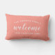 O travesseiro decorativo lombar "na moda" apresenta apenas o texto moderno de script "Bem-vindo" em branco com texto personalizado arquivado que pode ser personalizado com o monograma do sobrenome da sua família e o seu endereço de rua. Dois design laterais na frente e atrás incluídos. O texto branco e o fundo cor de laranja/cor de rosa podem ser modificados para coordenar com o decor doméstico.