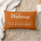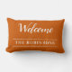 Travesseiro personalizado elegante apresenta "Bem-vindo" em tipografia de script branco em fundo laranja queimado com o sobrenome de sua família para dar boas-vindas aos seus convidados. Desejando-lhe um outono acolhedor e caloroso com toda a alegria que a estação traz. Aproveite!