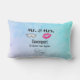 Um travesseiro personalizado para um aniversário de casamento com um design de tendências - lábios de kissy cor-de-rosa glamourosos e uma ilustração de bigode retrô masculina. palavras retrorativas dizem Sr. e Sra. e você pode personalizar com seu nome e anos juntos. Definido em um fundo de aquarela azul.