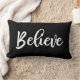 Acreditem na escrita manual | Travesseiro decorativo de férias com padrão de xadrez de búfalo preto e branco no verso. Design de tipografia moderna de uma fazenda feita por Blackberry Boulevard "Acredite", escrita em uma fonte preta em um fundo branco sólido. Outras cores disponíveis no armazenamento. Travesseiro de sotaque perfeito para sua decoração de casa de férias.