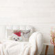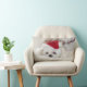 Um travesseiro com uma fotografia adorável de um cãozinho branco giro vestindo um chapéu de natal vermelho.