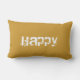 Almofada reversível de tipografia inspiradora amarela e branca Bee happy tem abelha de um lado a palavra feliz do outro lado
