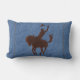 O travesseiro de sotaque estilo Lumbar apresenta uma pintura digital original de Leslie Sigal Javorek que captura a aparência de couro marrom com ferramentas com um vaqueiro, cantar é o chapéu no ar, sobre o seu cavalo de dança sobre um fundo denim lavado com pedra.