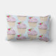 Travesseiro lombar bonito com padrão repetitivo composto por uma ilustração de um cupcake delicioso com espirais cor-de-rosa e uma baga com folhas aninhadas no glacé. Colocado sobre um fundo de aquarela azul claro.