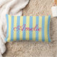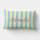 Custom lumbar pillow, designed with light blue and yellow stripes and personalized with the name of the recipient in a hot pink color. Easy to edit on both sides! Perfect as a gift, ideal to add a fresh touch of personality to any room. More versions and matching articles with original designs are available in my collections. Feel free to contact me if you need any help to customize this or other items from my store.