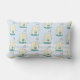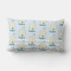 Um travesseiro lombar com padrão com um dinossauro sorridente, bochechas rosadas cor-de-rosa e RAWR escrito em sua barriga. 3 estrelas felizes coloridas acima de sua cabeça. Colocado sobre um padrão de bolinhas e listras azul-claro e branco.