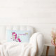 Um travesseiro com um ditado engraçado: Eu faço mágica. Projetado com um unicórnio alado branco com mané rosa, cauda e cascos. A buzina tem anéis de cor arco-íris e parece um pirulito doce. Este unicórnio fofo está se erguendo nas pernas traseiras. Doce cor-de-rosa na bochecha e longos cílios femininos. Um arco-íris colorido ao lado da palavra mágica.
