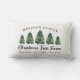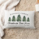 Travesseiro de acento lombar retangular da Fazenda de Natal personalizada em verde, cinzas de carvão e cores brancas. Apresenta um moderno design de tipografia rústica com 3 árvores de Natal verdes e cortadas recentemente. Personalize com seu nome de família, localização e outro texto personalizado. A design de dois lados faz um sotaque personalizado único ao decoro de férias de sua fazenda.