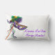 travesseiro lombar branco de 13" x 21", com uma imagem, em ambos os lados, de uma bela máscara púrpura, verde e dourada sobre um pau com penas e fitas de coordenação, e o texto, "Laissez Les Bon Temps Rouler" (Deixe o Bom Tempo Rolar em Francês), em roxo francês. Veja toda a coleção de Travesseiros Mardi Gras no DECOR | Seção Travesseiros.