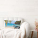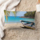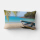 Um travesseiro lombar com uma cena de praia tropical idílica. Água clara de cristal azul turquesa e uma praia arenosa castanha macia. Algumas folhas de palma penduradas de cima. Um velho barco a remo de madeira fica sentado na praia. Uma paisagem serena e pacífica.