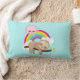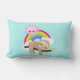 Um travesseiro com uma ilustração com uma preguiça castanha engraçada e feliz pairando em um galho de árvore. Um arco-íris colorido atrás dele junto com um sol rosa pairando sobre a cabeça. Bonita, adorável e moda.