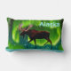 Uma imagem de alce (Alces Alces), um pouco estilizada, silenciada contra as Luzes do Norte. A leitura de texto "Alaska" aparece em azul e branco brilhantes. Personalize adicionando seu próprio texto adicional no verso.